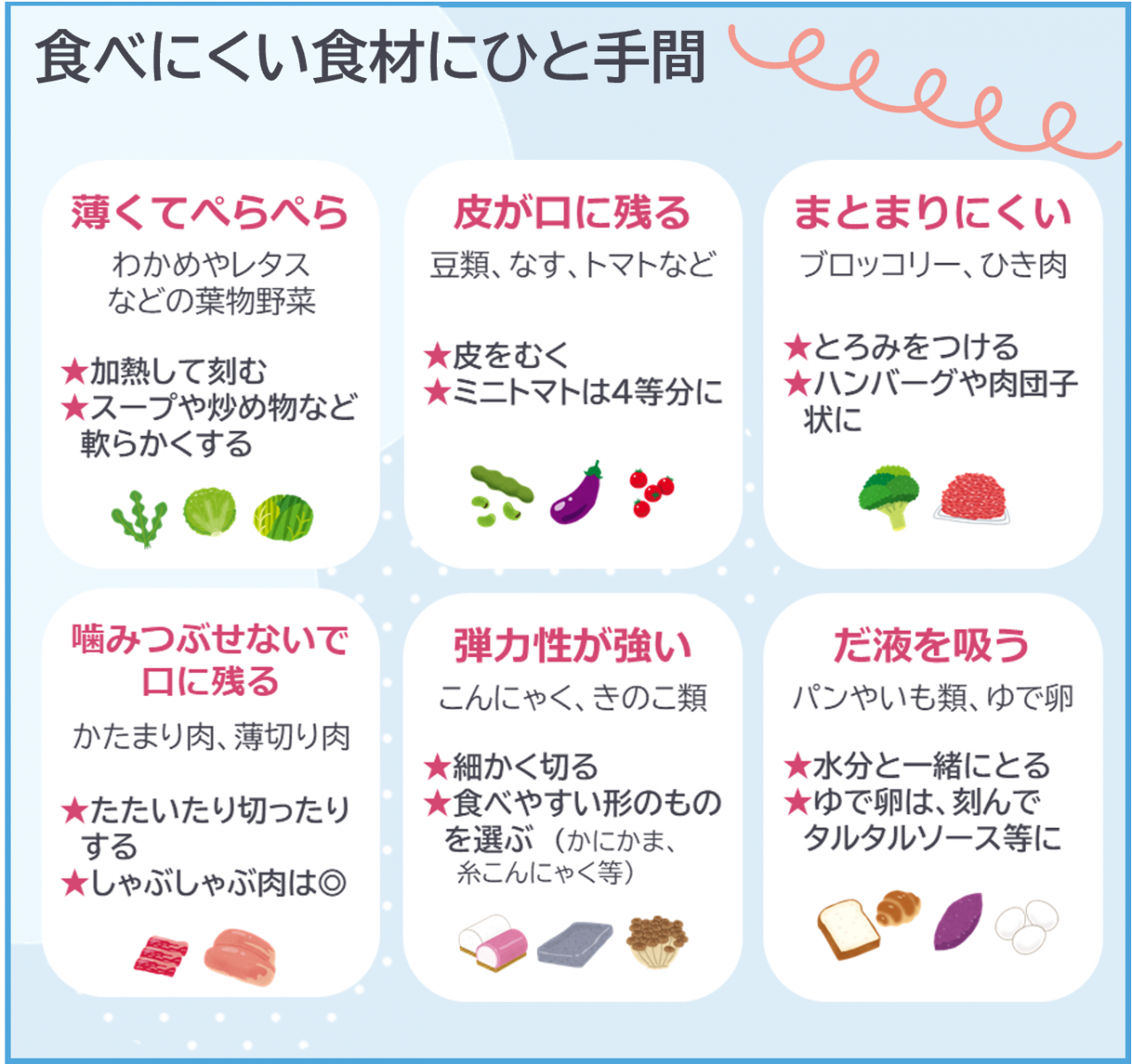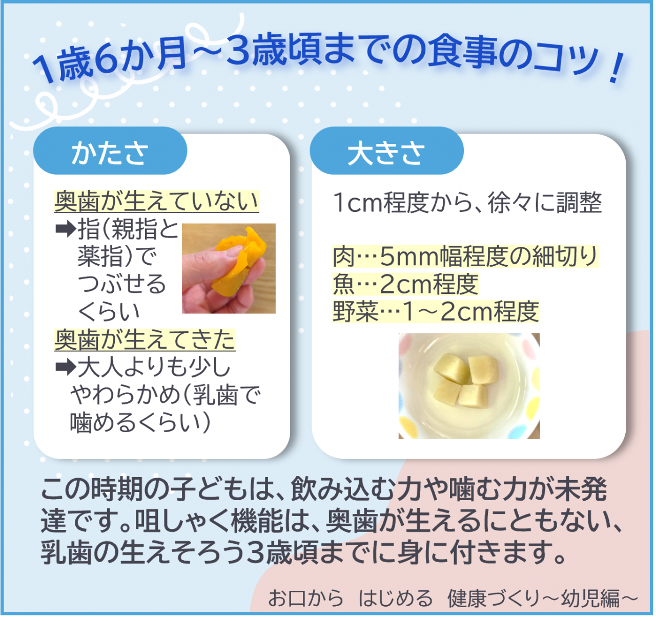 乳歯の生えそろう3歳頃までは、食べにくい食品があるのを知っていますか?ちょっとした工夫が、安全で楽しい食事時間につながります。